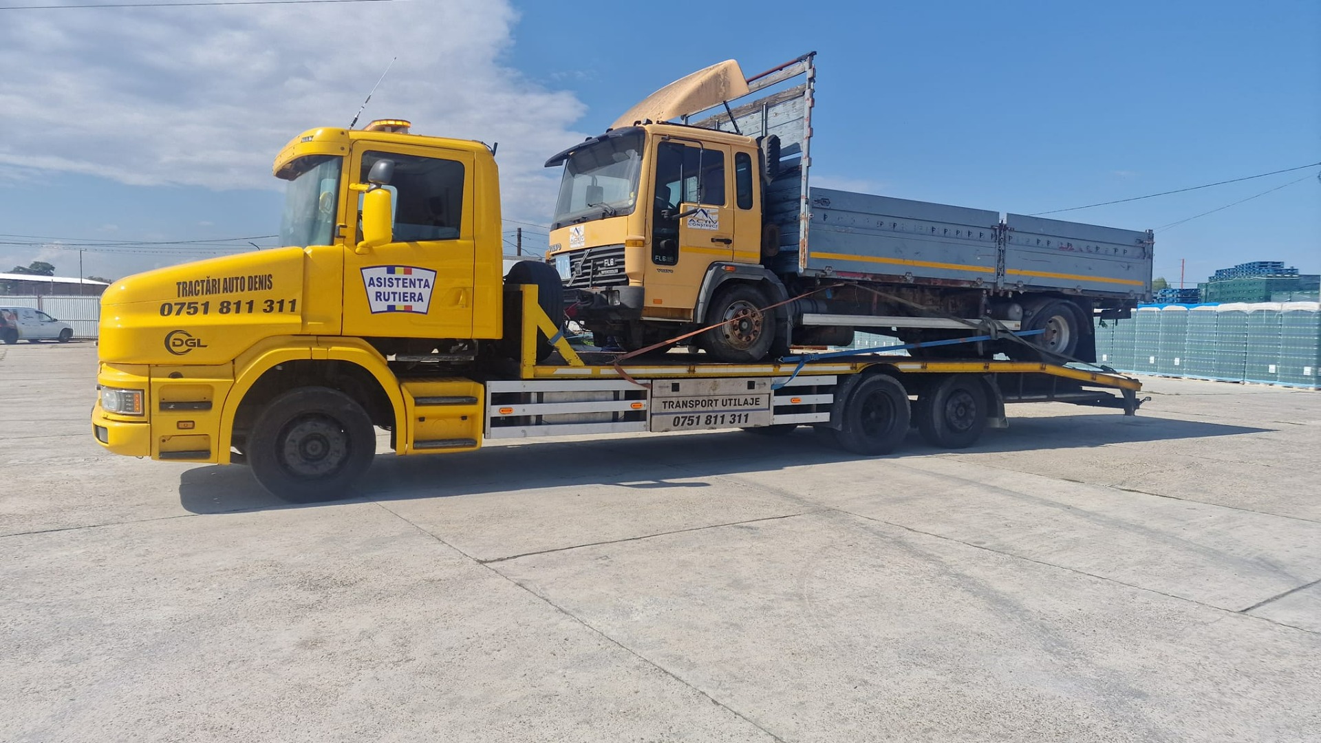 Tractam si transportam pentru tine pe platforma cu macara, autovehicule, autoutilitare, utilaje agricole, utilaje pentru constructii si containere in conditii avantajoase.